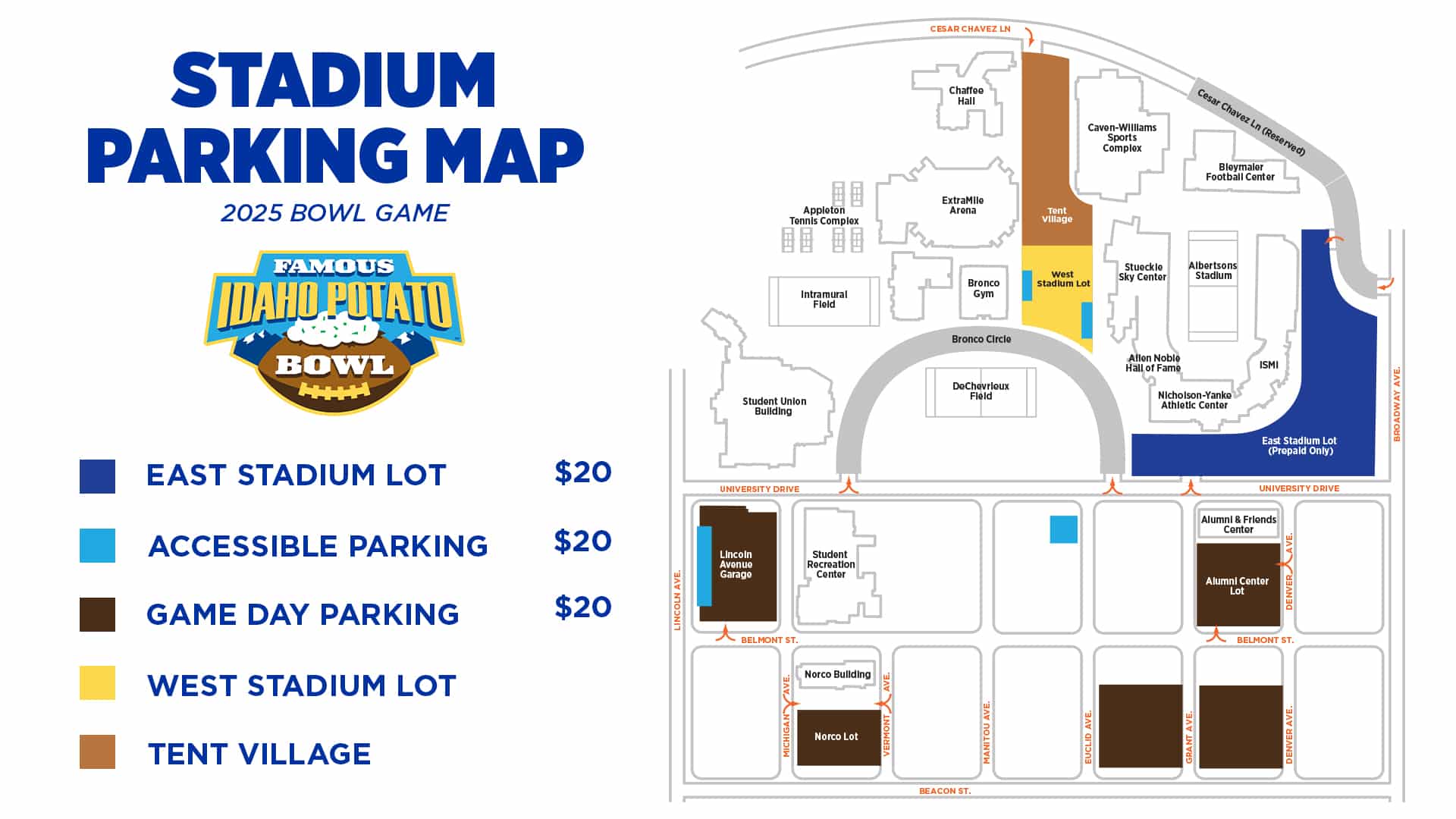 Kickoff family time with the greatest pregame ever at the Famous Idaho Potato Bowl. This year there will be free food and drinks along with french-fries provided by Simplot, The Famous Idaho Potato Truck, Music, Corn Hole, and a Football Youth Clinic in Caven-Williams Indoor Facility.
